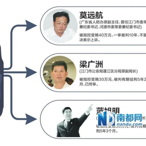时至今日,以上多宗关联案件已陆续在广东各地开庭。2013年底,莫远航一审被判有期徒刑10年,他不服判决表示上诉。江门市公安局蓬江分局原副局长梁广洲受贿案,省高院于2014年7月中旬左右对提出上诉的梁广洲裁定维持原判,判处其有期徒刑5年2个月,并处没收财产人民币10万元。