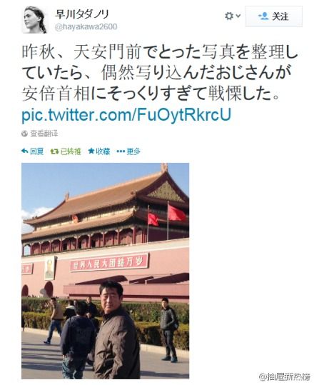 【潜入搜查篇】日本推友@hayakawa2600 近日整理去年在北京拍摄的照片,猛然发现一张天安门前的照片内的路人面貌酷似安倍