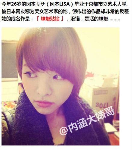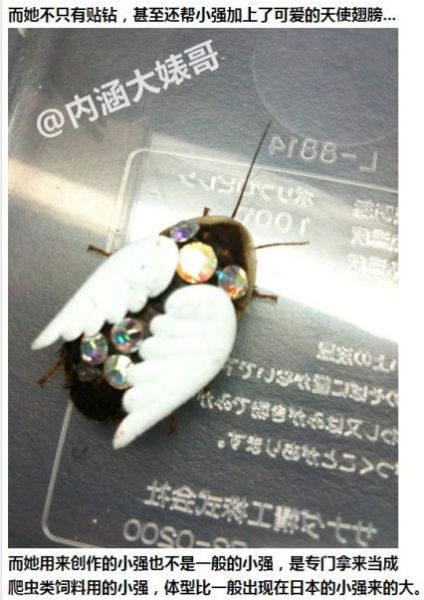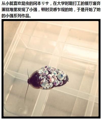 今年26岁的冈本リサ毕业于京都市立艺术大学,被日本网友称为美女艺术家的她,创作出的作品却和本人非常的反差....。.她的成名作是:“ 蟑螂贴钻 ”,没错.。.贴的不是手机,嗯..。.贴的是蟑螂本人...。.是活的蟑螂...。.