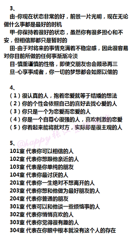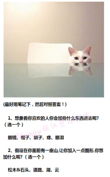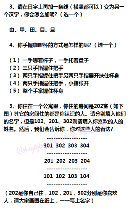 神准!日本最红的心理测试 新浪新闻客户端_原创 2014.11.0716:38 关注 【日本最红的心理测试】测试见多了,但这么邪门、这么神准的测试我还是头一回遇到!看似简单的问题折射出来的答案是那么地透彻,把我们内心所想全都被一览无遗。童鞋们快来试一下吧~ 责任编辑:范煜喆 SN097