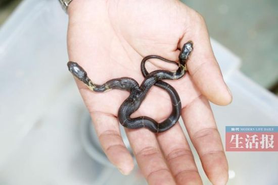 黄先生家住广西玉林,从事养蛇生意已经有十多年的时间了。7月底时,他和几个工人像往常一样,从碎蛋壳里捡拾刚孵化的小蛇。当工作结束时,他发现小蛇堆里有一条双头蛇。