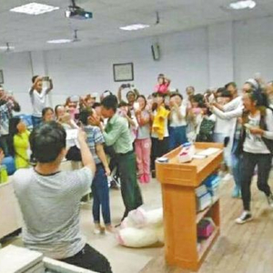 视频显示:讲课桌旁边摆放一玩具熊,女生手拿一盒鲜花。一身穿教官服的男子在教室讲台附近,缓缓走向一穿横条纹T恤、黑色裤子的女生,拥抱并亲吻了该女生,现场聚集了几十名学生为其助威呐喊,多名同学用手机拍摄记录下了这一场景。