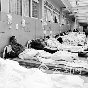 “吃了酒席,起先没感觉,到了凌晨4点多,肚子就痛起来了,然后就又拉又吐,一起参加婚宴的家人也出现了同样的症状。”20日上午,新平彝族傣族自治县扬武镇头甸村村民普祥云躺在玉溪市人民医院急救室的床上,他已经比前晚送到医院时好转了一些,但感觉身体还是乏力。18日下午,头甸村一村民 在当地公房里办婚宴,一共请了70桌。热闹的婚宴后,客人们于当晚和次日陆续出现了恶心呕吐和拉肚子的症状。一些村民在当地卫生院治疗,还有一些被送往玉 溪市人民医院等中心城区大医院治疗。截至昨日上午11时,玉溪市人民医院、玉溪市儿童医院和玉溪市中医院共收治了参加此次酒席的46名病患。至截稿时记者 了解到,已有两名患者经治疗后出院。