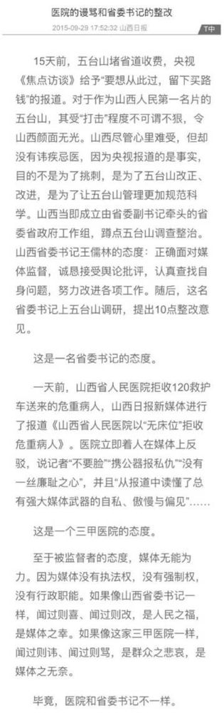 令人震惊的是,这家省级报纸方面并没有就医生提出的这些质疑给出解释,反而大笔一挥,写出了一篇名为《医生的谩骂与省委书记的整改》的稿子,宣称记者合理的舆论监督遭到了医生无理的谩骂,要求医院学习山西省委书记王儒林在面对央视的批评时,所表现出的谦虚。