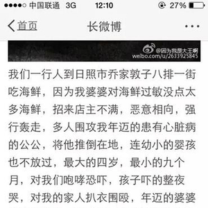 青岛“天价虾”事件余波未息,10月6日,河南游客再曝日照旅游时遭遇宰客,因点海鲜太少招来店主不满,家人被扒衣围殴,年迈的婆婆被殴打住院。