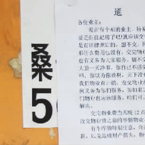 “这个通知只是针对个别人,措词上是有些不妥,我们会尽快将通知揭下来。”刘先生说,物业接管时,欠二次供水费和高层电梯电费10多万元,都是物业公司拿的。接管后就拿钱修路、做防水,给员工开工资,共花了几百万元。10月份才开始收今年5月至明年5月的物业费,小区现有1000多户居民,目前交物业费 的有100多户,多数居民是理解和支持物业的,物业正在号召小区居民成立业主委员会,这样更方便管理。