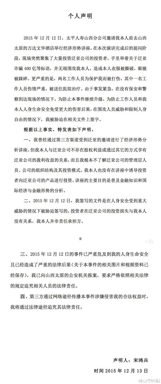 2015年12月12日,我本人受邀前去山西太原的万达文华酒店举行讲座,会场聚集了大量的向泛亚公司投资的人员,并无端对我进行了围攻,对我本人的人身 生命安全造成了极大的威胁。为此我已向当地公安机关报案,要求严格依法追究相关人员的法律责任,以维护我的合法权益。我本人针对该事件特发表如下声明。