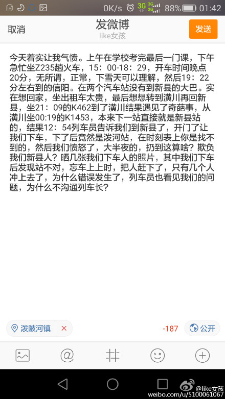 1月23日凌晨1时53分,网友@like女孩在微博上称,其从潢川乘坐23日零时19分的K1453前往新县。零时54分,列车员通知车上旅客,火车已到达新县站,打开车门让旅客下车。下了车之后才发现是泼河站。
