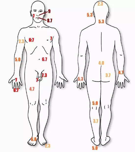 美国康奈尔大学的Michael L. Smith:安排蜜蜂叮咬自己25个身体部位,来确定叮哪里疼痛最小(头皮,脚趾中趾尖和上臂),哪些部位最疼(鼻孔,上嘴唇和阴茎海绵体)。
