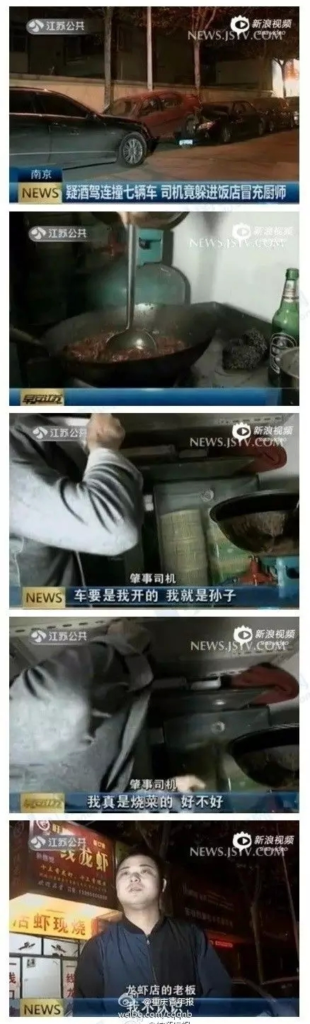 南京一司机因酒驾撞到停在路边的车,致7辆轿车挤在一起,发现自己闯祸了,他竟跑到龙虾店假装厨师烧起菜来。