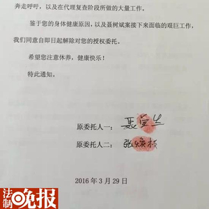今日下午,法晚记者(微信公号ID:fzwb_52165216)从网上一则题为“关于解 除聂树斌案代理律师授权委托的通知”。通知中写道:“陈光武律师:您好!我们非常感谢您几年来为聂树斌故意杀人、强奸妇女案奔走呼吁,以及在代理复查阶段 所做的大量工作。鉴于您的身体健康原因,以及聂树斌案接下来面临的艰巨工作,我们同意自即日起解除对您的授权委托。希望您注意休养,健康快乐!特此通 知,2016年3月29日”。