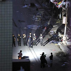 5月10日,郑州惠济区薛岗中街,警方在拆迁户杀人事发地附近值守。当天下午,一名男子持刀捅死3人,捅伤1人,后被警方击毙。 图/CFP
