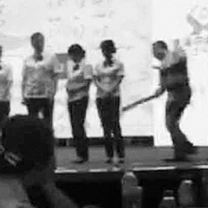 在舞台上,培训师拿着板子抽打员工视频截图