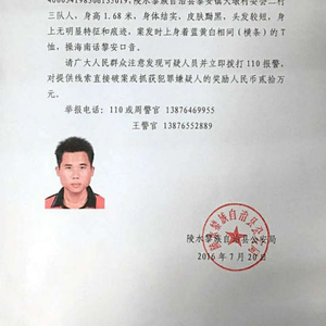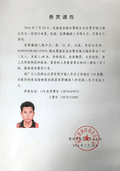 海南陵水村干部入户调查被杀 警方悬赏20万缉凶