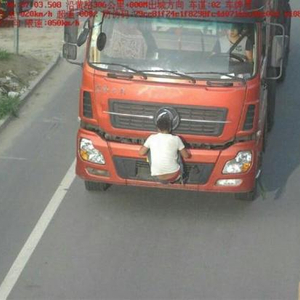 西安市公安局交通警察支队发图称:活久见!这种遮挡号牌的方式也是没sei了。图为一个人挂在大货车前挡住车牌,图上资料显示,应该是摄于2016年7月28日。