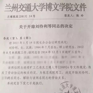 兰州交通大学博文学院开除刘伶利的文件。 网络图片