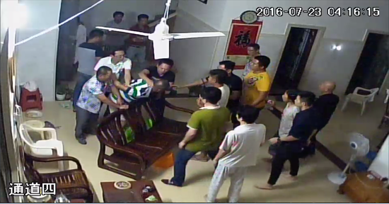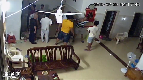 记者在肖裕伟家人提供的监控视频中看到,7月23日凌晨3点55分,庄银辉带着10余名保安队员闯进肖裕伟的家中,部分保安队员手持长棍或短棍。“当时我们正在睡觉,他们来了就不断地敲门,不开就恐吓。”肖裕伟的家人说,保安队员闯进屋后说肖裕伟偷了摩托车,要把他带走。肖裕伟再三声称没有偷过摩托车,但还是遭到保安队员的殴打。在家人的保护下,肖裕伟逃回房间,才躲过一劫。