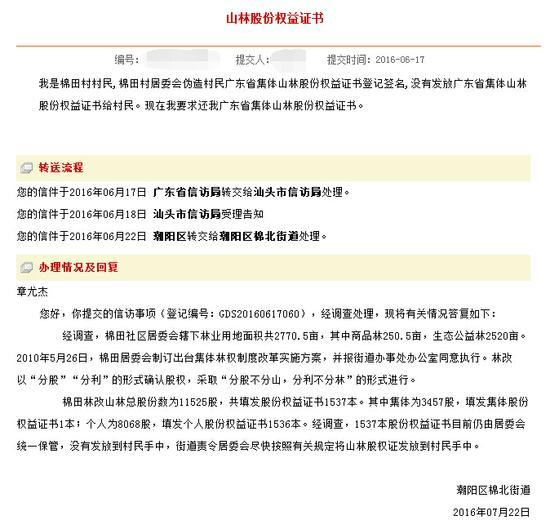 此事引起了潮阳区政府和棉北街道的高度重视,两级政府在接到村民信访诉求后立即着手解决。目前,棉田居委会已经陆续将山林股权证发到村民手中,并承诺尽快发放截留3年的生态公益林补偿金共10万余元。