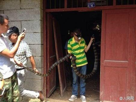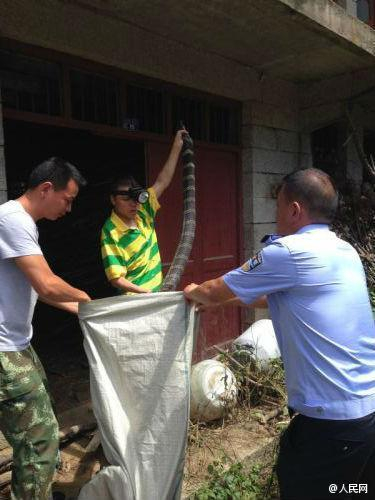 9月5日晚,浙江温州泰顺县仕阳镇沙丘村杨梅岭15号一楼的柴草房内闯入一条大蛇,并引起当地居民恐慌。由于蛇过于巨大,当地派出所及消防一时不敢擅自处理,只得安排附近居民暂时迁出家。到9月6日早上,泰顺县森林公安联系上当地一蛇养殖场的专家赶往现场,经过一个多小时的仔细抓捕,专家最终徒手将大蛇制服。经过称重,该蛇竟然达23斤,体长在3米多。 (来自:浙江在线、温州网)