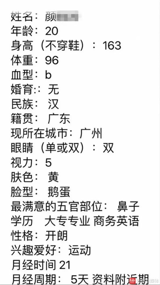 在她的朋友圈中,有不少供卵源女子图片,一般附带血型和身高信息,有时还会标注姓名(一般为化名)、年龄、民族、籍贯、学历、专业、生理期等信息。