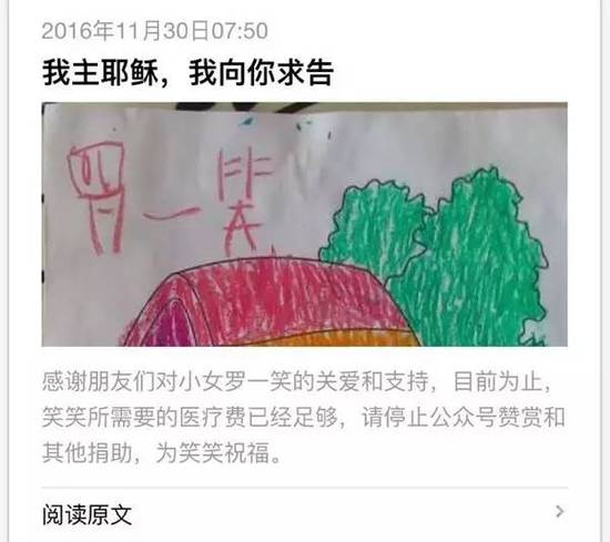 发布在“罗尔”微信号上的《罗一笑,你给我站住》一文披露了孩子患病后这一家的窘境。
