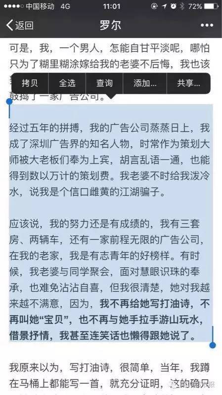 南都记者发现,罗尔本人于今年7月5日在个人公号上发文描述,其岳父母均为大学教授,丰衣足食。其本人经营广告公司,有三套房产、两台车。