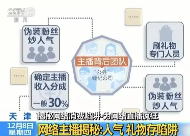 如果遇上一位大手笔的金主,主播是不是就能赚得盆满钵满呢?据了解,很多主播背后还有团队在操作。这个团队有的叫“公会”,有的叫经纪公司,为了包装主播,团队成员分工明确,其中就有人专门组织伪装粉丝互相“炒人气”、刷礼物,进而带动很多真实观看直播的网友刷礼物凑热闹,为主播花钱。在直播平台扣除一部分钱之后,剩下的钱会打给主播背后的团队,而主播最终的收入分成也要由经纪公司来确定,一般为30%左右。