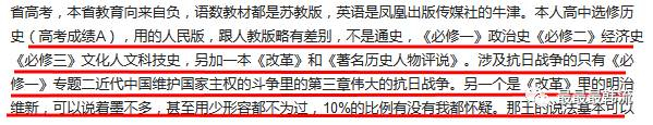 而根据某知乎用户的评论,他使用的《苏教版》里,日本的部分除了中国维权战争和抗日战争,以及明治维新之外啥也没有。