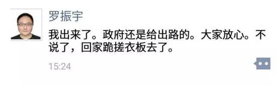 罗辑思维的罗胖子罗振宇则充分发扬了自嘲精神,他在朋友圈中调侃道:“我出来了。政府还是给出路的。大家放心。不说了,回家跪搓衣板去了。”