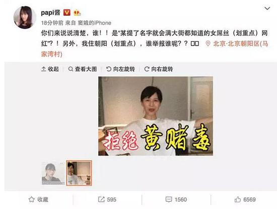 文中暗指的“某提了名字就会满大街知道是谁的女屌丝网红”papi酱甚至因此而上了微博热搜。Papi酱因此不得不在其个人微博账号“徐汇一条渣”和“papi酱”上连发两条微博进行辟谣:“扫黄这种事情,就算真是我,那我也是“扫”的那一方,怎么可能是“黄”的!”而且使用了“拒绝黄赌毒”的配图,就连发布微博手机的名称都改成了“窦娥的iPhone”。