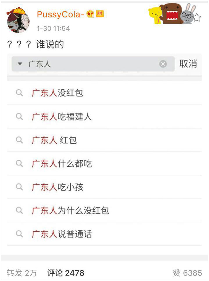 昨日(30日),网友@PussyCola- 惊奇地发现,微博搜索榜上,竟然出现了关键词“广东人没红包”,谁说的,难道广东人的红包被年兽吃了?