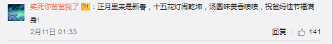 - 笑死你爸爸我了:正月里来是新春,十五花灯闹乾坤,汤圆味美香喷喷,祝爸妈佳节福满身!