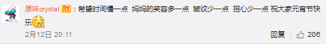- 原味crystal:希望时间慢一点 妈妈的笑容多一点 皱纹少一点 担心少一点 祝大家元宵节快乐