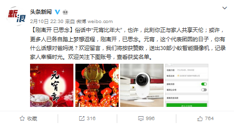 元宵节是个阖家团圆的日子,2月11日当天,头条新闻发起了#刚离开,已思念#的告白父母活动,引发近500万网友参与,评论数达1000条。你们这么热情,小浪有点(hen)羞(kai)涩(xin)呢!