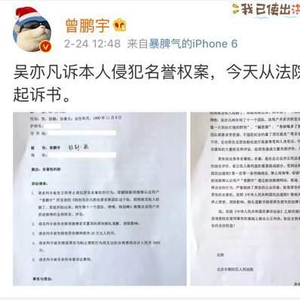 今天晚上,《法制晚报》记者获悉,网络大V、微博签约作家曾先生近日被加拿大籍明星艺人吴亦凡告上了朝阳法院,索赔20余万元。曾先生在其实名认证的新浪微博发表了一篇非原创的文章《转的吴亦凡粉丝要求换团队这个贴,刚刚被发帖人给删了,那就再贴出来,两年第11个团队,啧啧,特别棒》。涉事文章称吴亦凡两年用了11个团队,还带有“你家爱豆就像一只到处打炮的野狗”、“骗资源”、“香槟喝多了泡未成年粉丝”、“每个团队都要求带资源,不签经纪合约拿了项目就走”等字眼。该文章一经发出,引发其他网络用户以及相关媒体的大量转发和评论。吴亦凡认为自己和粉丝受到了恶意侮辱和人身攻击,于是起诉曾先生要求道歉并索赔。(法晚微信公号ID:fzwb_52165216)