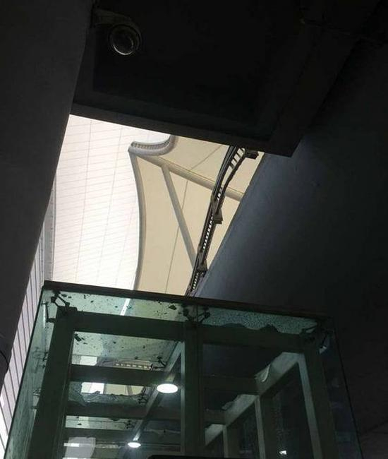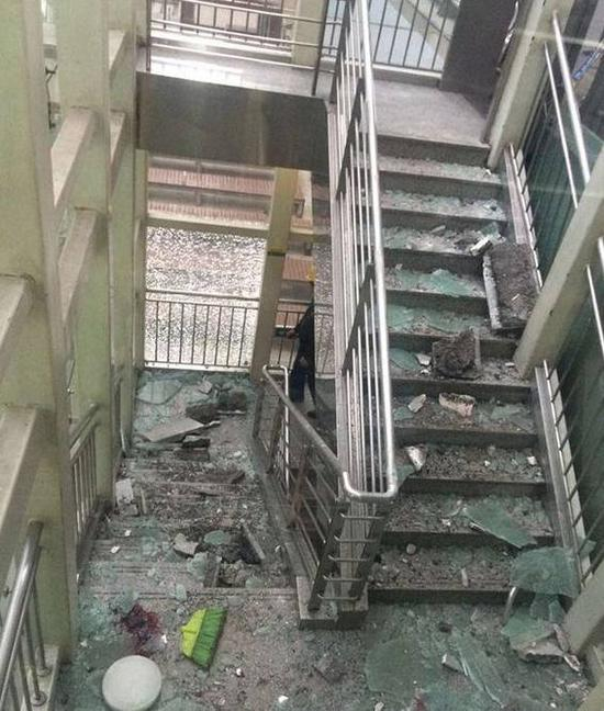 事发区域下方是一个玻璃墙面的楼梯间,车辆撞击护栏同时撞毁了下方的水泥墩,导致大块水泥块掉落砸碎了玻璃,被撞的那名行人随后坠落至下方六七米处的楼梯间。还有两名行人本在楼梯间行走,被掉落的水泥块及玻璃砸伤。