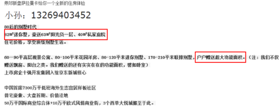 在一些销售发布的宣传材料中,小面积大赠送成为重要卖点,“购买别墅可获赠20-30平米的院子加南北露台”。