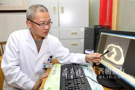 拍完片,做完CT检查以后,接诊的烟台山医院心胸 外科主任医师杨军发现:患者右肺上叶有一个长约1.5厘 米的异物,胸腔内出现了积血、积气。他结合患者的工 作情况断定患者是被锻压产生的金属碎片击伤。