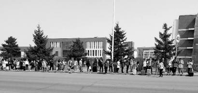 这一边,等候乘坐班车的学生们排起了长队
