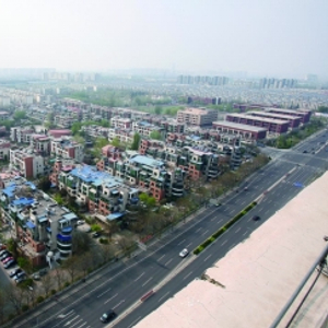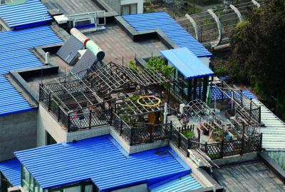 ▲从高处俯瞰月桂庄园小区可见大片蓝色屋顶,这些多为后来居民自行修建的违建 |