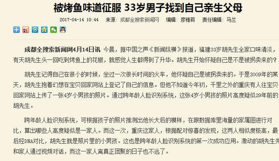 新闻的内容大致是这样的:“今晨,据中国之声《新闻纵横》讲述了一个真事:33岁男子全家吃饭都很清淡,有天他第一次吃四川烤鱼,瞬间被那麻椒、辣椒的味道所征服,觉得自己的人生都被改变了!于是他开始怀疑自己的父母为什么从不吃这么好吃的东西?自己是不是从四川被拐卖来的啊?他竟然上走失儿童网站发了自己照片…最后,竟然找到了,他就是被拐卖的。”