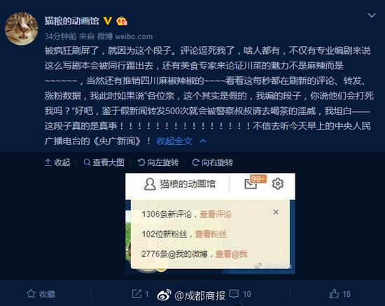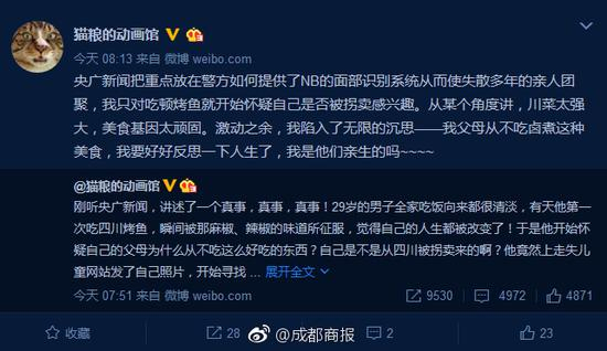今天,成都全搜索新闻网报道了一条新闻火了,《被烤鱼味道征服 33岁男子找到自己亲生父母》,同时,微博加V认证的网友@猫粮的动画馆同时也在微博上发布了这条新闻。