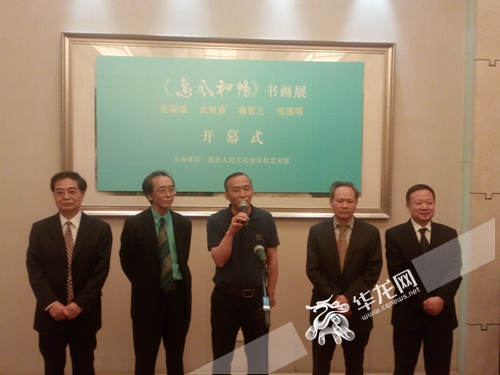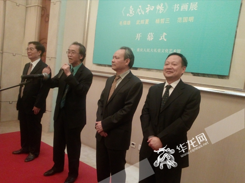 华龙网4月29日17时讯(记者 姜连贵)这里演绎着艺术的交响,璀璨的建筑,笔墨的旋律,带着灵感直扑眼帘,直荡心窗。这是一个让哲人三思的展出,色彩与色彩的交融,诗思与欣赏齐舞,这是一个让人流连的展出,心灵与心灵的交融,感性与理性的同歌―――――毛锡雄、武辉夏、杨哲三、范国明《惠风和畅书画展》4月29日下午在重庆人民大礼堂文化艺术馆正式开展。