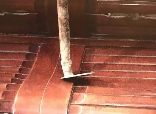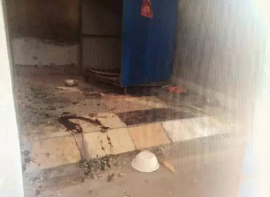 桌上、地上全是血,地上还有被打断的拖把和铁锹。