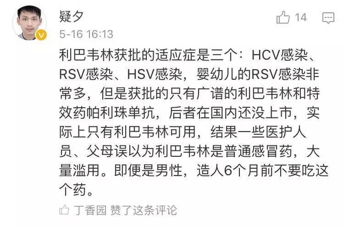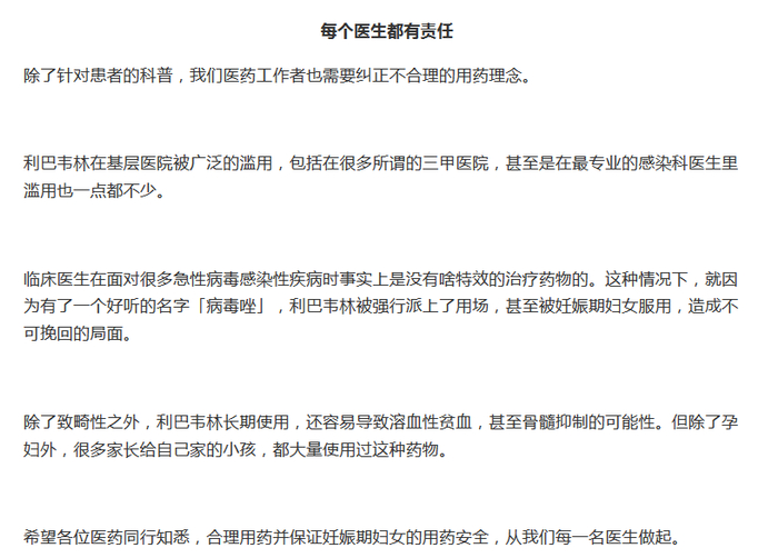 文章作者是北京药师冀连梅,在业界颇有名气。她强调,利巴韦林常称为“病毒唑“,明确可致胎儿畸形,目前国内最常见的问题是滥用它治疗病毒性感冒。