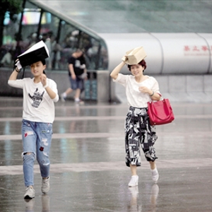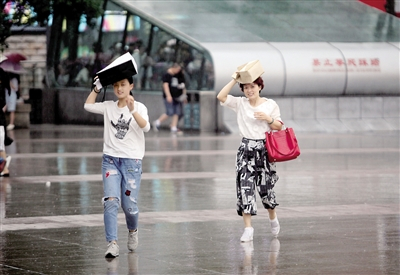 | 突然下雨,市民各显神通避雨。本报记者 雷键 摄 |