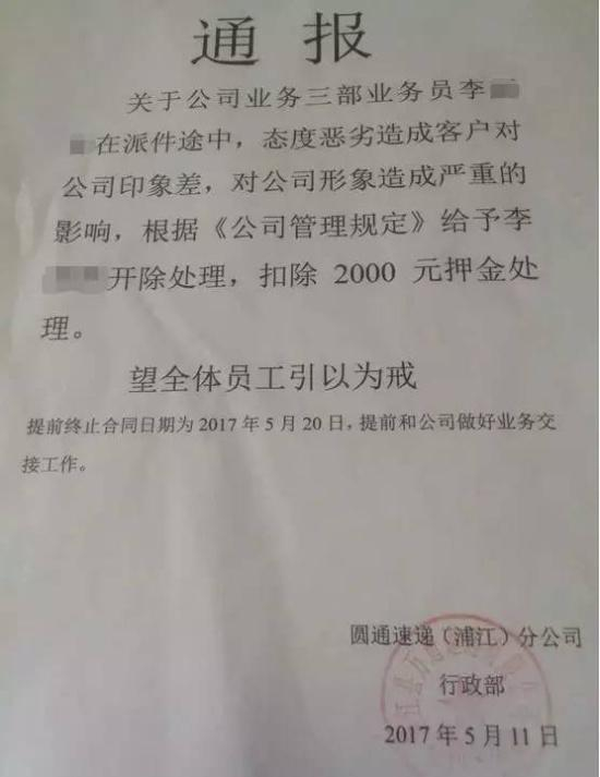 小天发来的截图显示通报的内容为:关于公司业务三部业务员在派件途中,态度恶劣造成客户对公司印象差,对公司形象造成严重的影响,根据《公司管理规定》给予李某某开除处理,扣除2000元押金处理。望全体员工引以为戒。