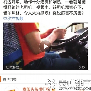 昨日中午,记者在新浪微博看到这篇博文,上面写着:贵阳某路公交车司机太牛了,边看手机边开车,动作十分连贯和娴熟,一看就是跑惯野路的老司机。博文还附上一段时长19秒的视频,在视频里,只见一名身着橙色短袖的公交车司机,一边开车一边玩手机。期间,驾驶员还双手脱离方向盘打字,眼睛看着手机屏幕不看道路前方。在换挡的时候,驾驶员的左手仍在拿手机,而方向盘则处于无人操作状态。