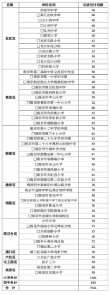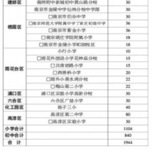 学校名称拟派位计划数玄武区科利华中学30第九初级中学60五十四中学40人民中学66弘光中学20海英小学40北京东路小学43北小阳光分校20长江路小学15洪武北路小学36北小红山分校14科利华小学38秦淮区南京市第三高级中学文昌初中校区50南京市第一中学初中部16南京航空航天大学附属初级中学40南京市第五初级中学30南京市游府西街小学30南京市中山小学28南京市秦淮区第一中心小学32南京市考棚小学88南京市府西街小学45南京市光华东街小学48南京市建邺路小学45鼓楼区南京市第十二中学初中部76南京市第三十九中学63南京市第二十九中学初中部32南京市第二十九中幕府山初级中学65南京市宁海中学分校46南京市鼓楼区第一中心小学41南京市琅琊路小学59南京市天正小学46南京市南昌路小学34南京市天妃宫小学44南京市鼓楼区第二实验小学52建邺区南师附中新城初中黄山路分校30栖霞区南京市金陵中学仙林分校中学部30南京市伯乐中学30南京师范大学附属中学丁家庄初级中学36南京市紫金小学36南京晓庄学院附属小学18南京市金陵小学和园校区18雨花台区小行小学10雨花外国语小学花神庙分校15共青团路小学15西善桥小学20雨外小善水湾分校22梅山第二小学22浦口区浦口区实验小学高新分校30六合区六合区广益小学30化工园区扬子三小40高淳区高淳区第二中学80高淳区实验小学30小学合计1104初中合计840合 计1944