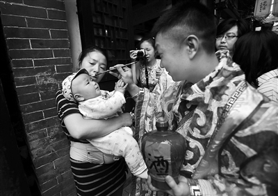 | 磁器口古镇,工作人员用雄黄酒给小朋友画额。 本报记者 甘侠义 摄 |